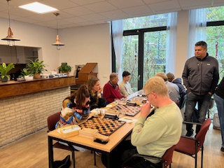 Voor de landelijke competitie heeft ons achttal in Den Haag een wedstrijdpunt gepakt. Tegen het derde team van Hofstad, een samengaan van inmiddels vele Haagse damverenigingen, werd er met 8-8 gelijk gespeeld. Overwinningen kwamen op naam van Kariem, Frans en Hans. Reinate en Laurent tekenden voor een remise. De overige drie partijen gingen naar de thuisploeg.